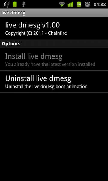 live dmesg is the one and only boot animation replacement that shows the actual dmesg log (kernel debug messages). It looks a bit similar to a BIOS boot. Handy for developers too! Unlike other similar apps, the information you see on screen is real and live, not a pre-recorded fake.